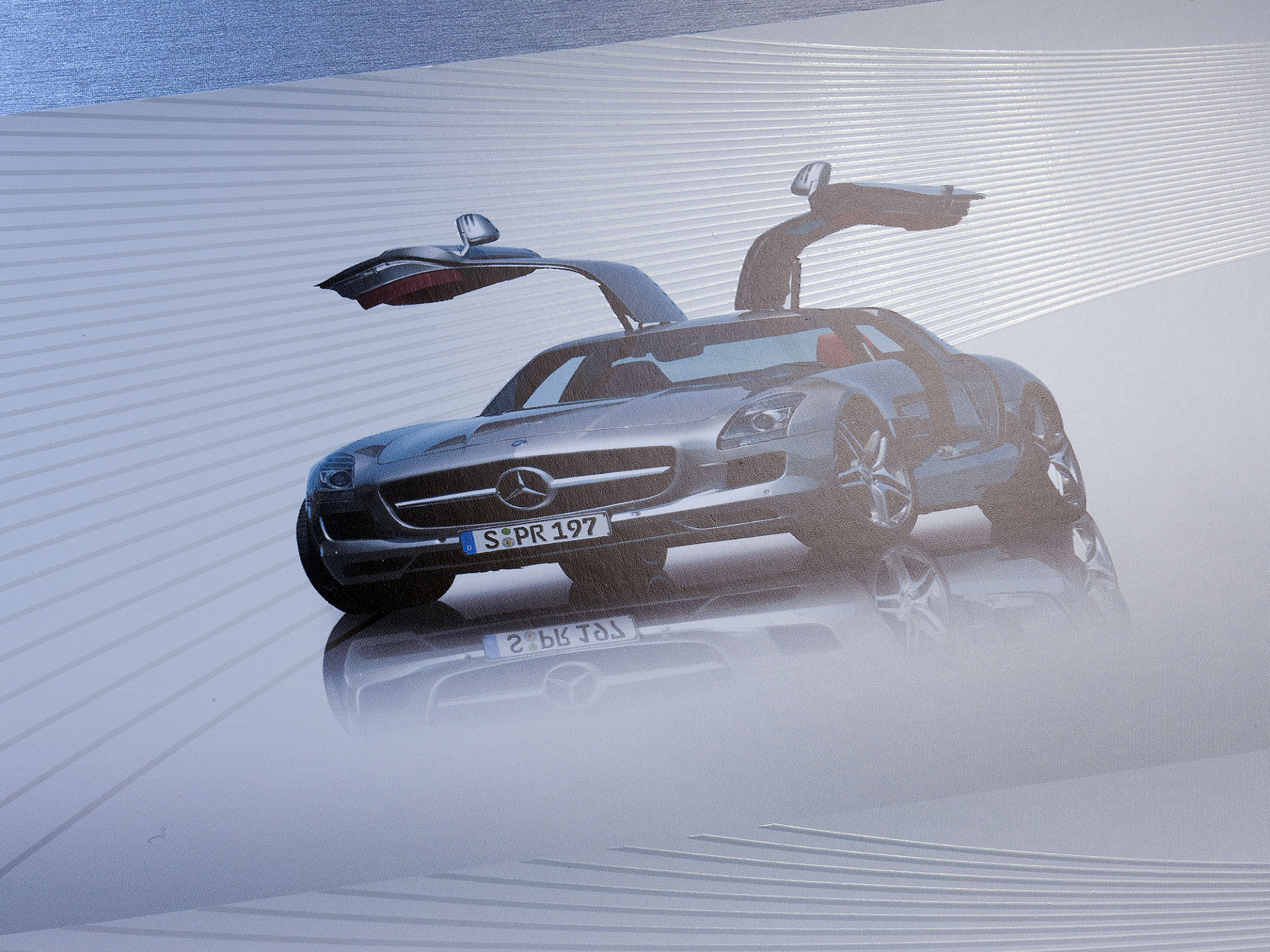 Durch Liniendesign im Relieflack wird dem Bild eine besondere Dynamik verliehen. Das Auto wird dabei gezielt und exakt ausgespart.