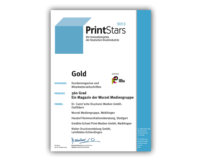Auch in diesem Jahr hat die RIEKER Druckveredelung GmbH einen der ersten Plätze belegt. Gold in der Kategorie 6 Kundenmagazine / Mitarbeiterzeitschriften mit dem Magazin "360 Grad“ von der Wurzel Mediengruppe in aiblingen. Die Druckveredelung nimmt nur einen kleinen Teil am Magazin ein, trotzdem freuen sie sich über den 1. Preis bei der Printstarverleihung 2013.