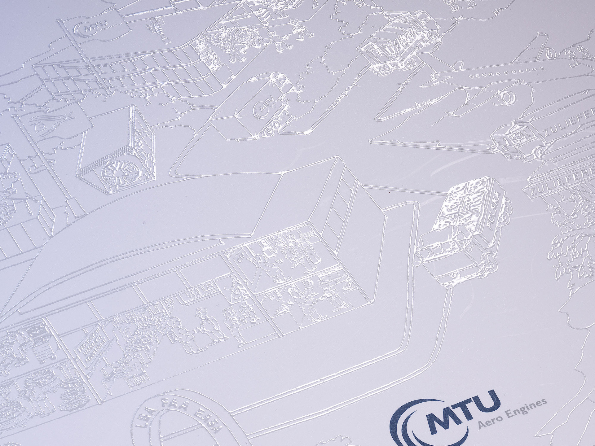 Die gedruckte Grafik wird durch glänzenden Relieflack so veredelt, dass ein 3-dimensionaler Effekt entsteht. Passgenauer Lackauftrag ist eine Voraussetzung.